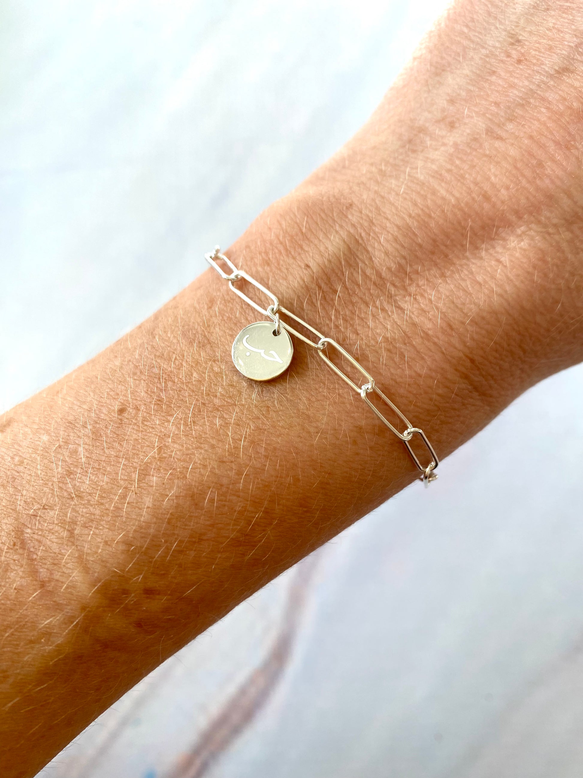 Beautiful paper link chain sterling silver bracelet with حب the Arabic for love engraved.