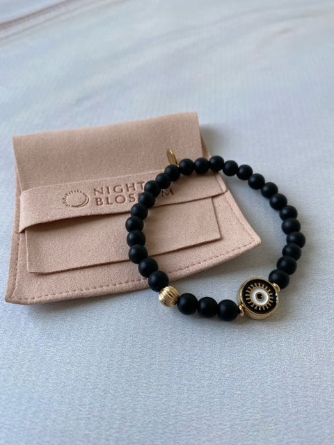 This handmade bracelet features black agate stones, a gold and black eye design and a gold filled, non-tarnish, accent bead.