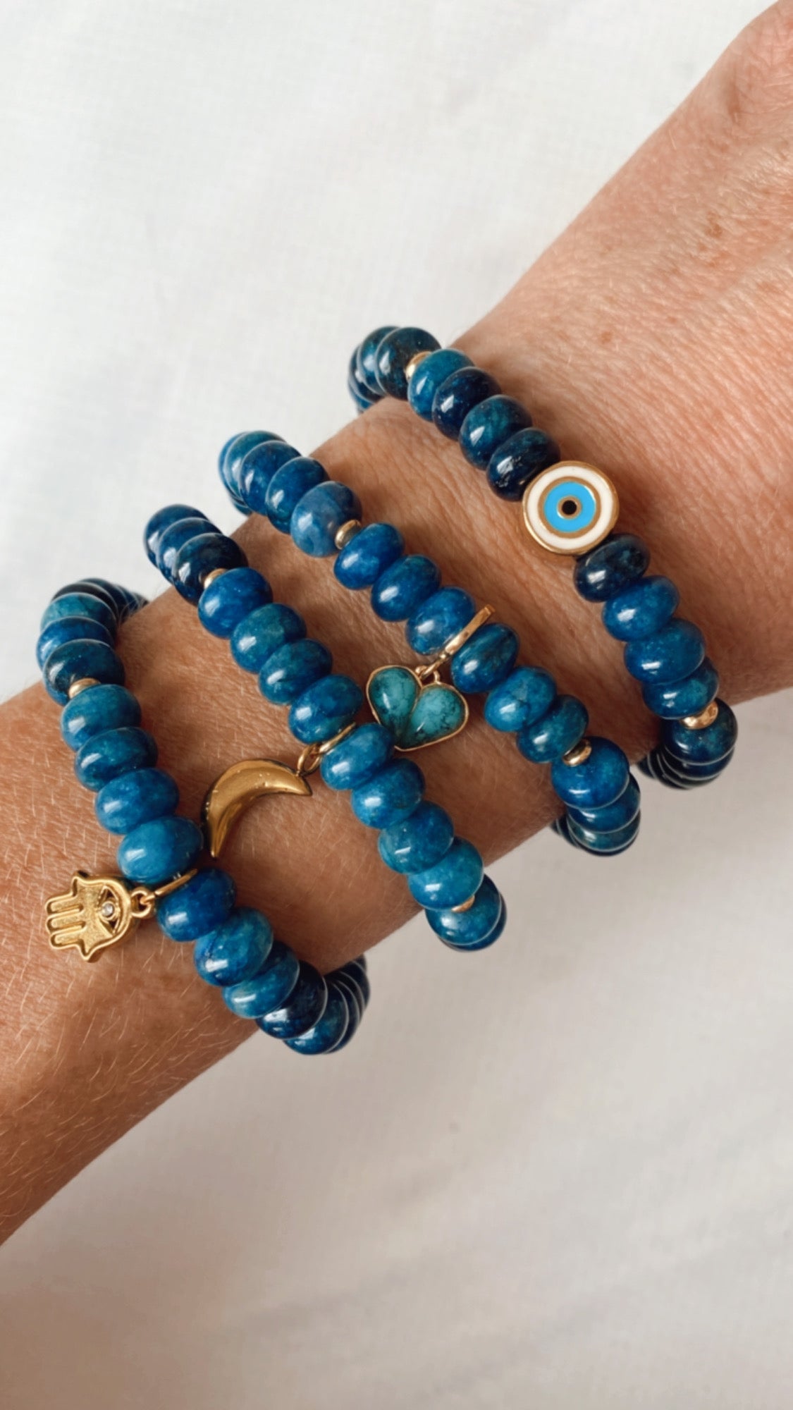 This bracelet is made with Blue Apatite which is thought to stimulate mental clarity, enhance communication as well as promoting a sense of motivation and confidence of expressing thoughts and ideas.