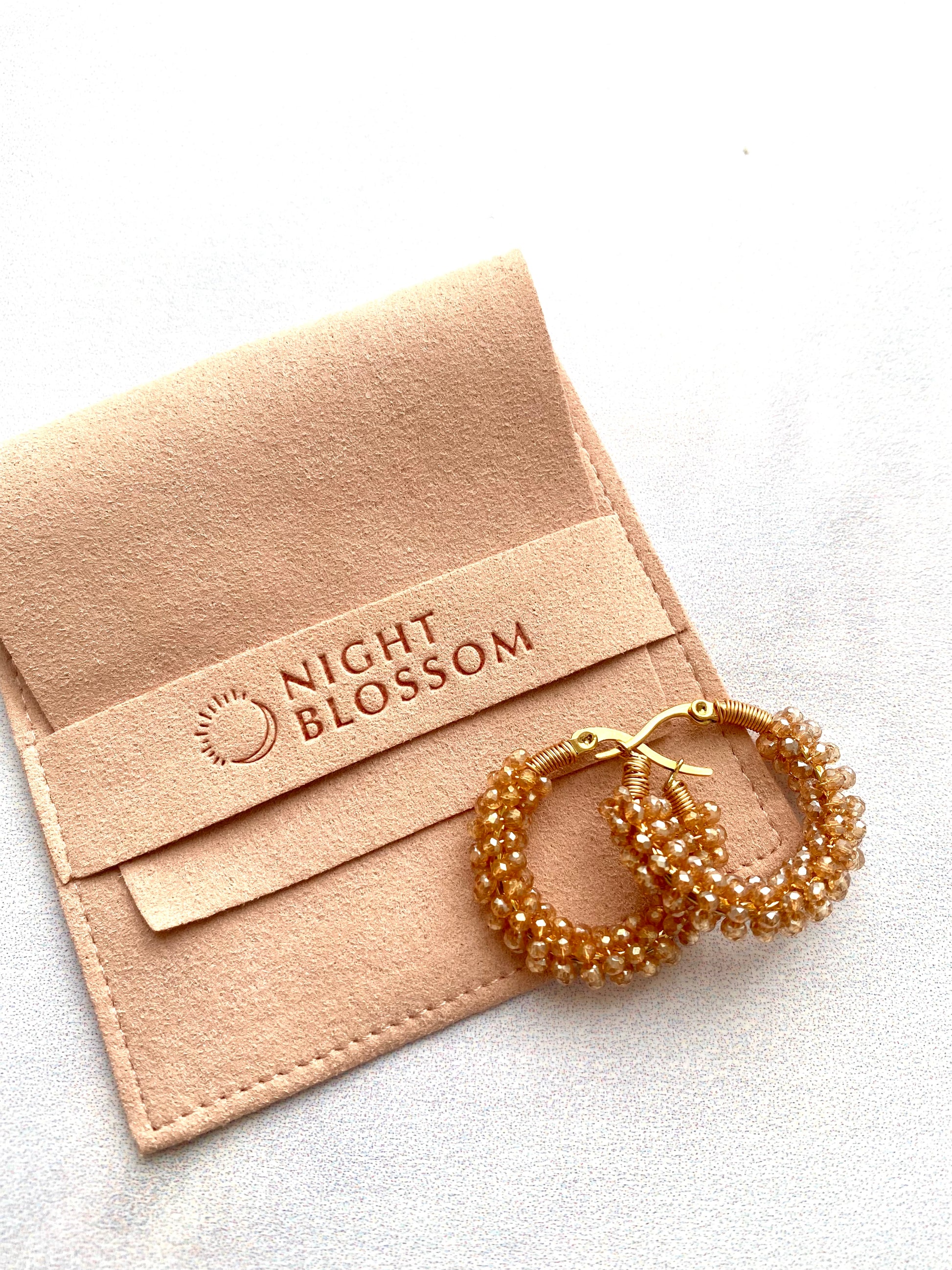 Gold plated stainless steel hoops with beautiful champagne coloured crystal embellishment.