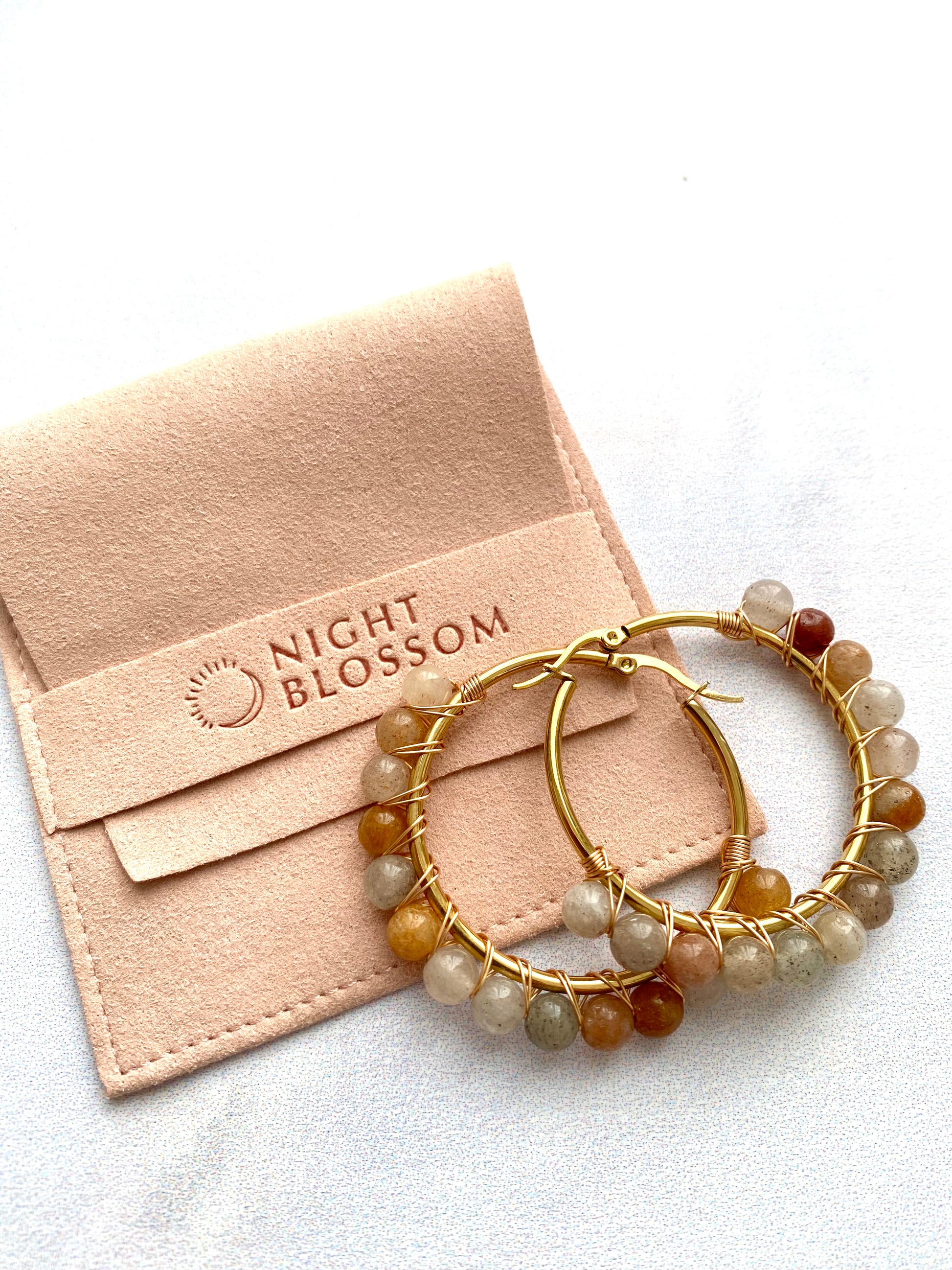 Stunning large hoops with natural earthy tone stone beaded embellishment.