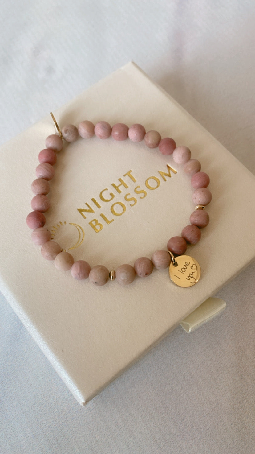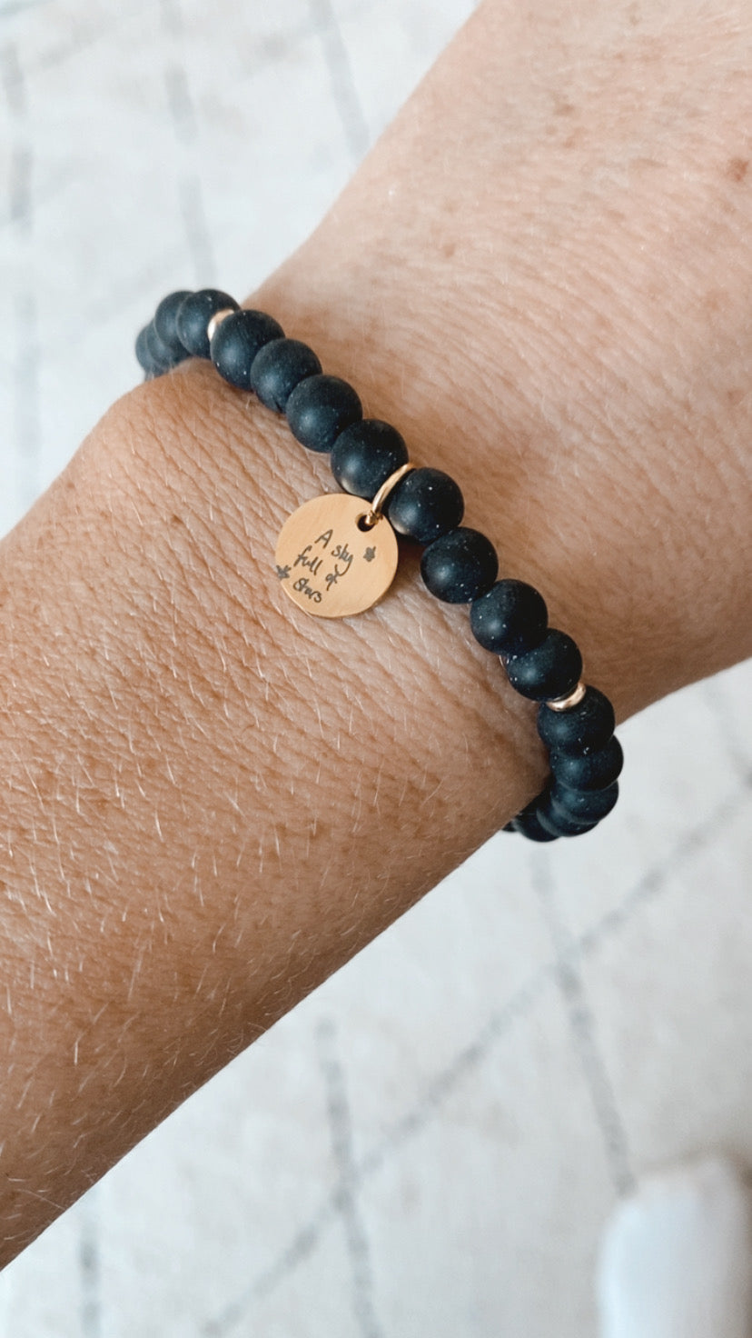 This gorgeous piece has an engraved, waterproof, charm with your choice of engraving, accented with non-tarnish, gold-filled accent beads.