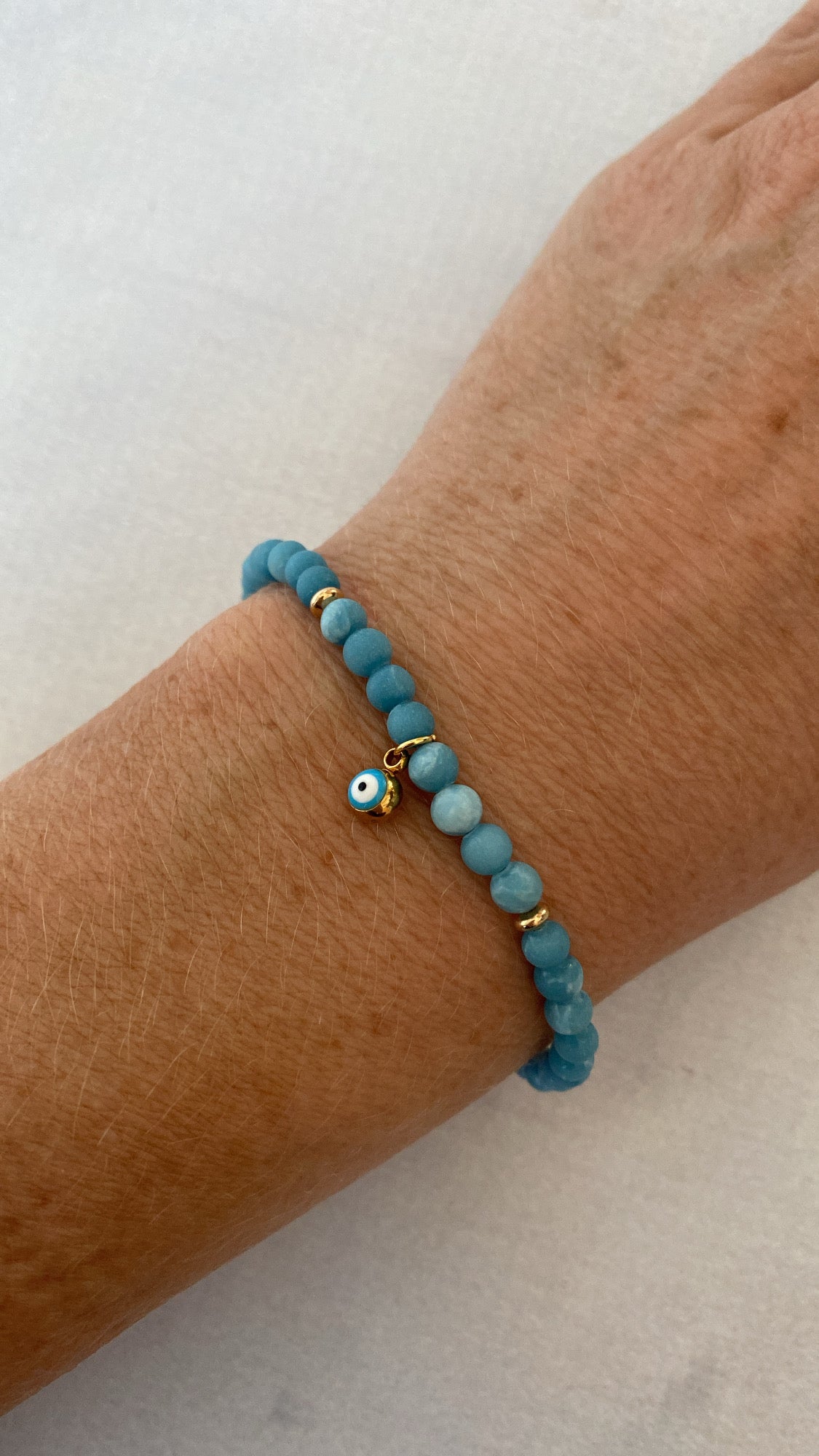 Beautiful blue 4mm 'Blue Sky' stone beads accented with a mini 'eye' waterproof charm. This delicate piece is perfect for stacking.