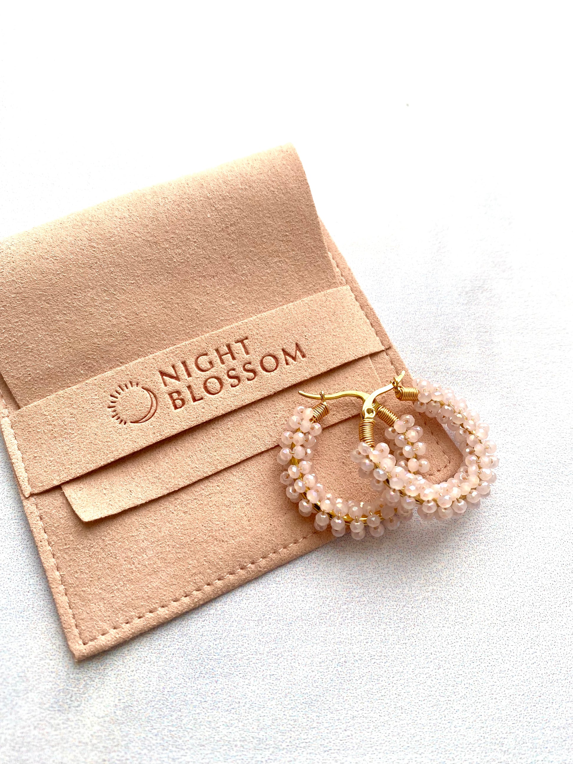 Gold plated stainless steel hoops with beautiful pale rose crystal embellishment.
