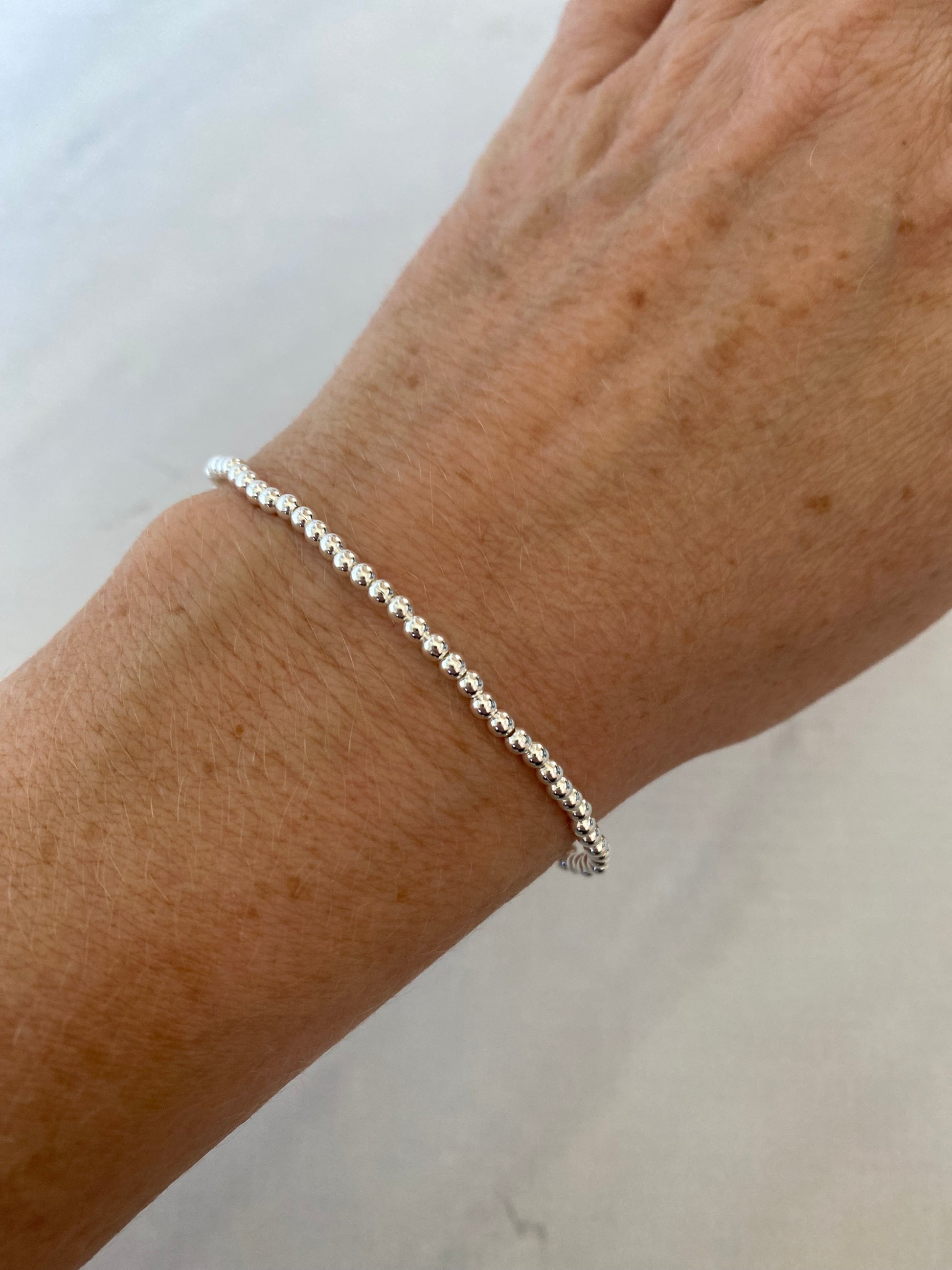 These gorgeous, delicate bracelets are made with 3mm, sterling silver beads. They are perfect for stacking with silver or gold pieces.