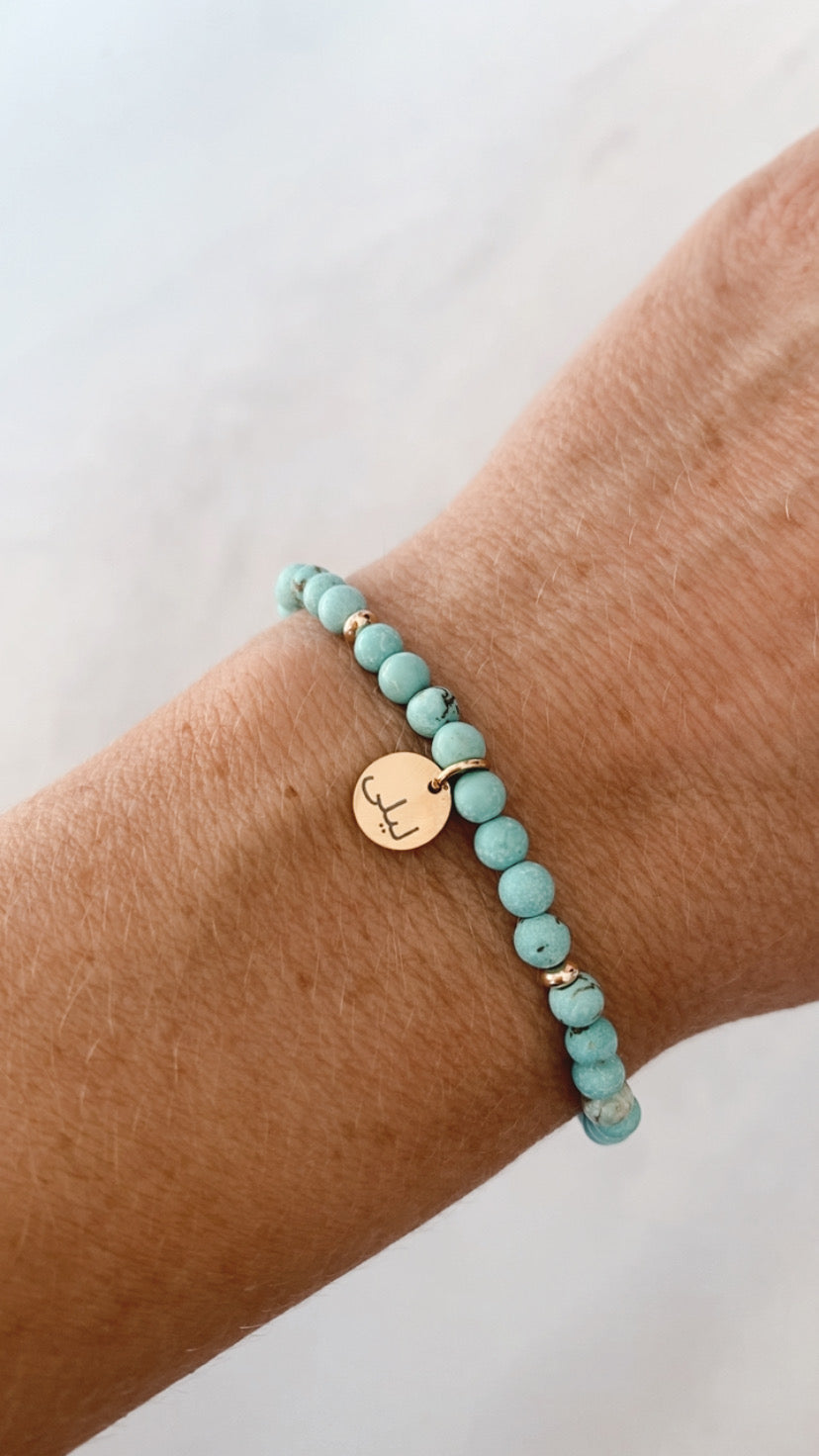 Made with 4mm natural stone beads in a choice of 5 colours. This gorgeous piece has an engraved, waterproof, charm with your choice of engraving, accented with non-tarnish, gold-filled accent beads.