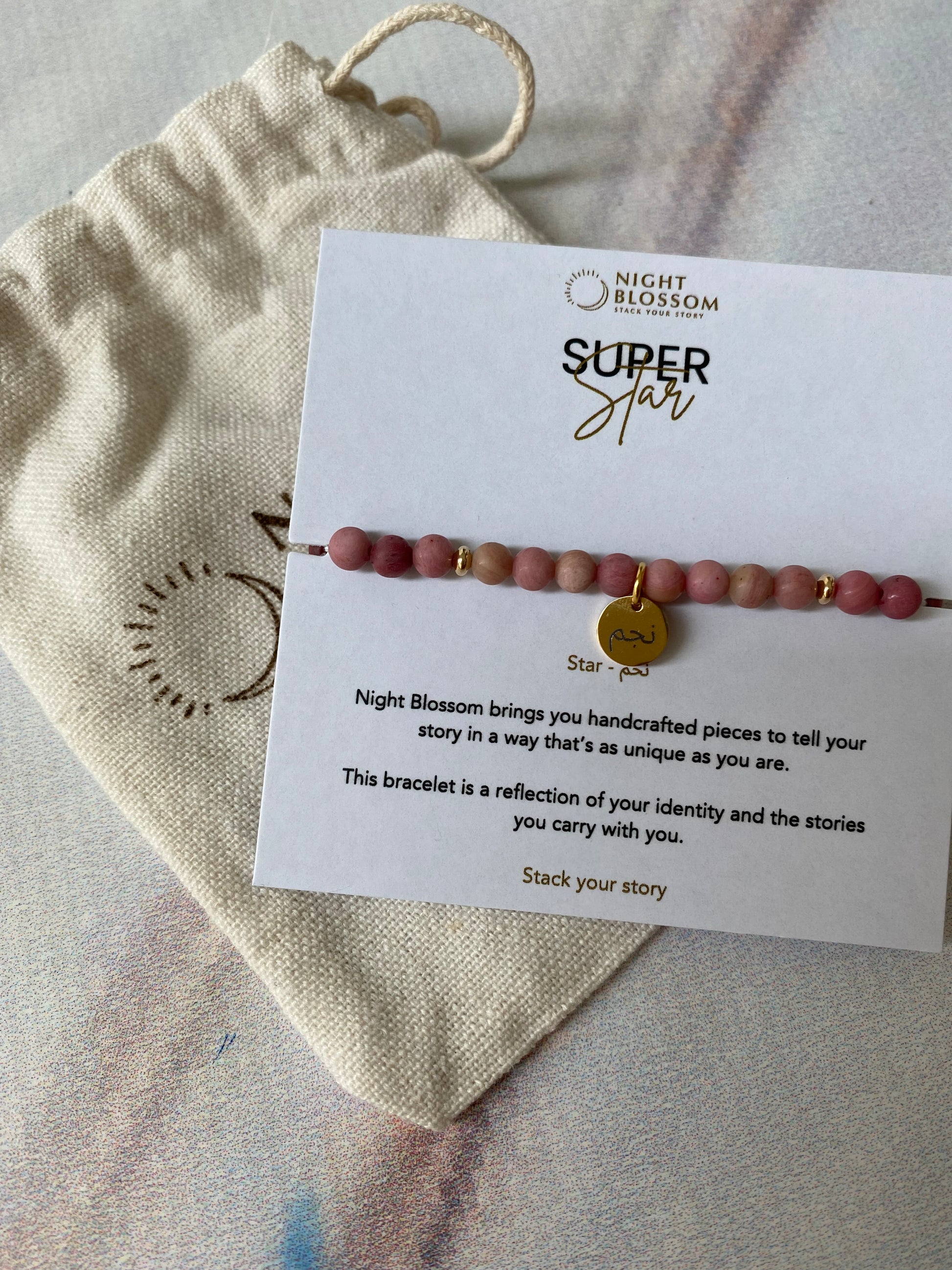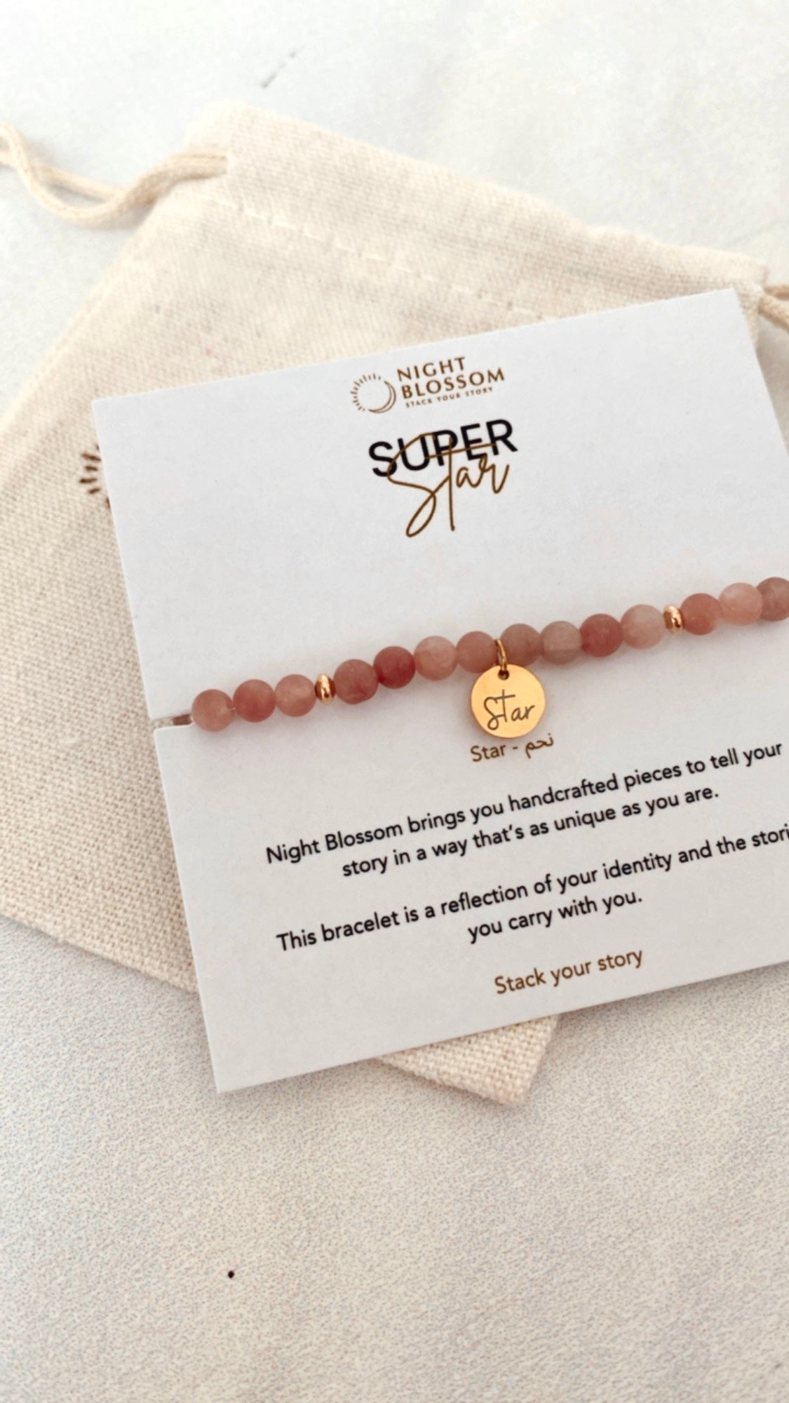 Made with 4mm natural stone beads in a choice of 5 colours. This gorgeous piece has an engraved, waterproof, charm with your engraved with 'star' in English or Arabic - accented with non-tarnish, gold-filled accent beads. This is set on a Thank you card - perfect for gifting.