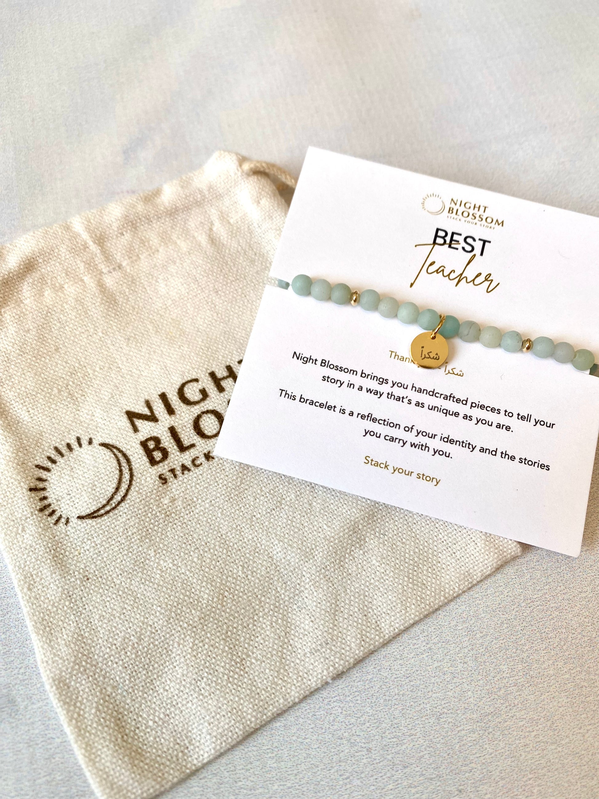 Made with 4mm natural stone beads in a choice of 8 colours. This gorgeous piece has an engraved, waterproof, charm with شكراً, thank you, engraved accented with non-tarnish, gold-filled accent beads. This is set on Best Teacher card - perfect for gifting.