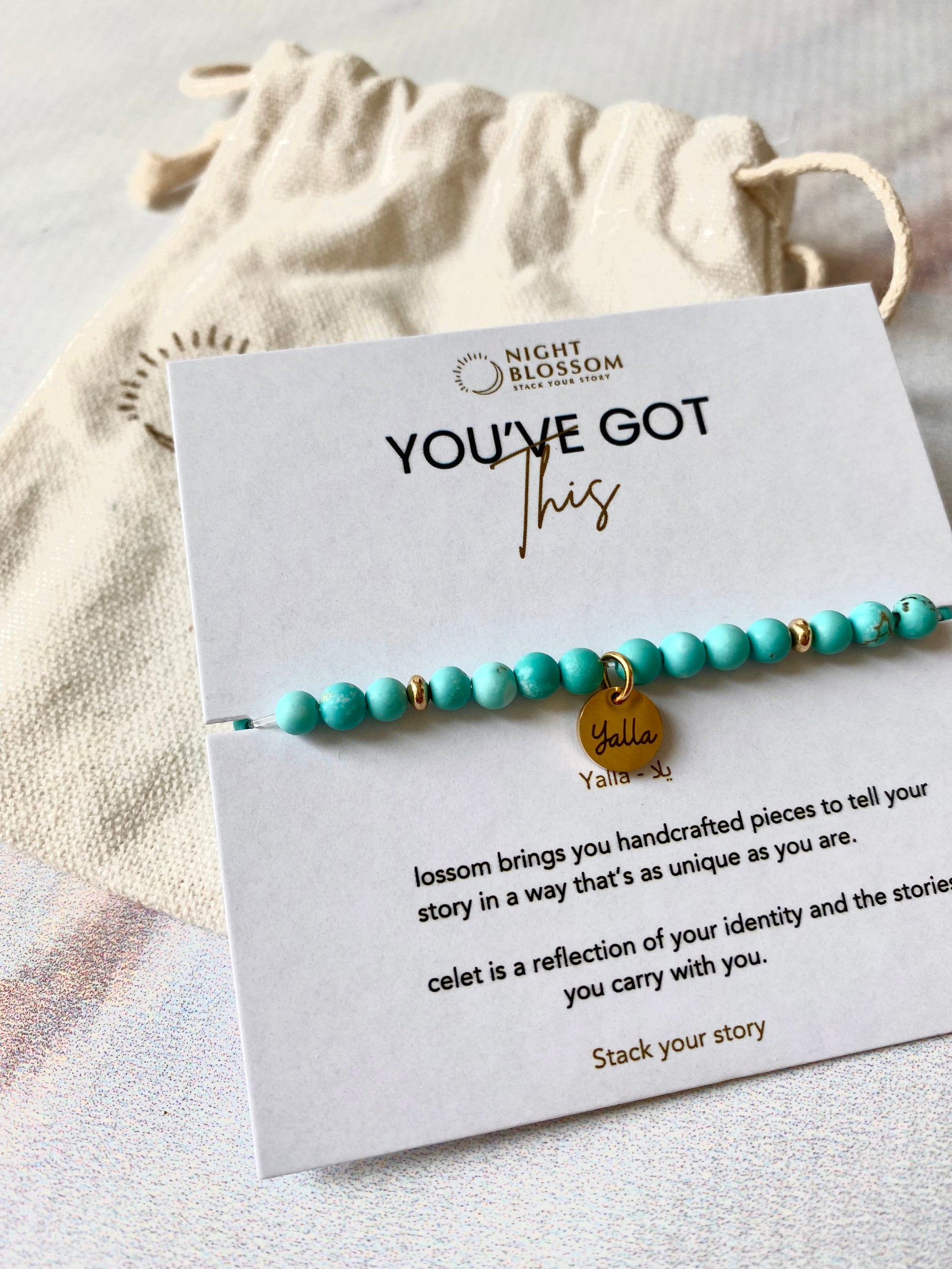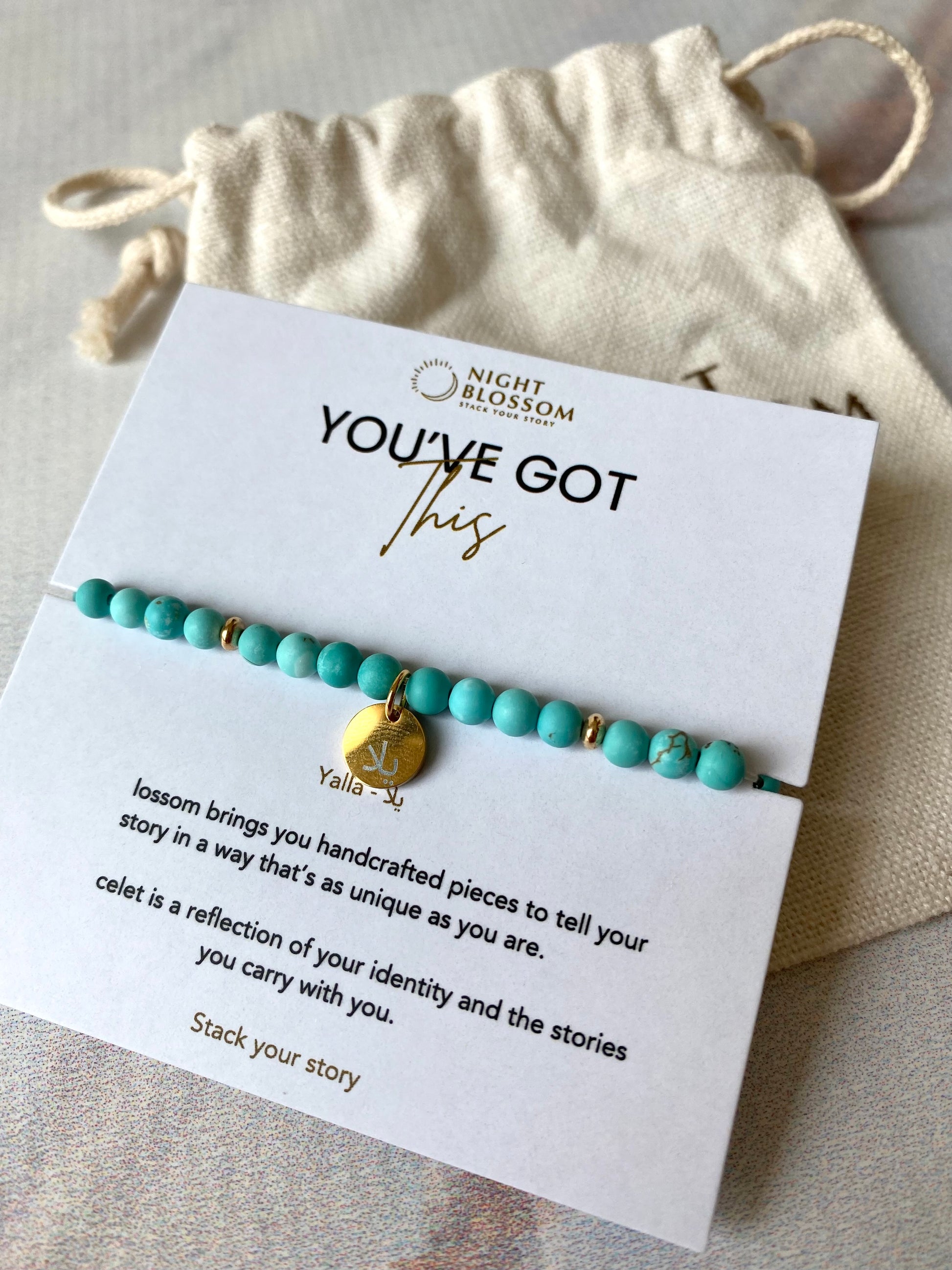 Made with 4mm natural stone beads in a choice of 5 colours. This gorgeous piece has an engraved, waterproof, charm with your engraved with 'Yalla' in English or Arabic - accented with non-tarnish, gold-filled accent beads. This is set on a Thank you card - perfect for gifting.